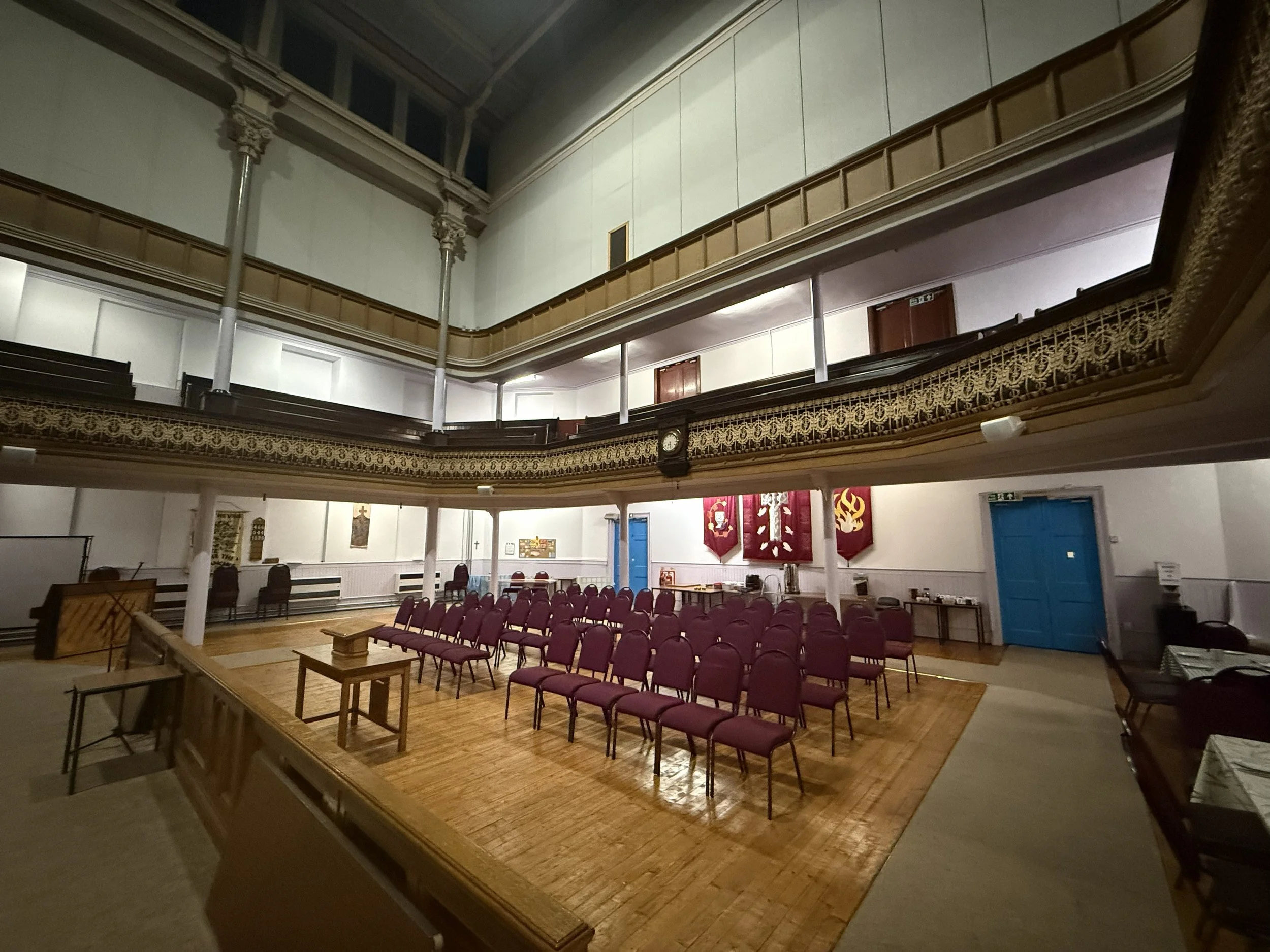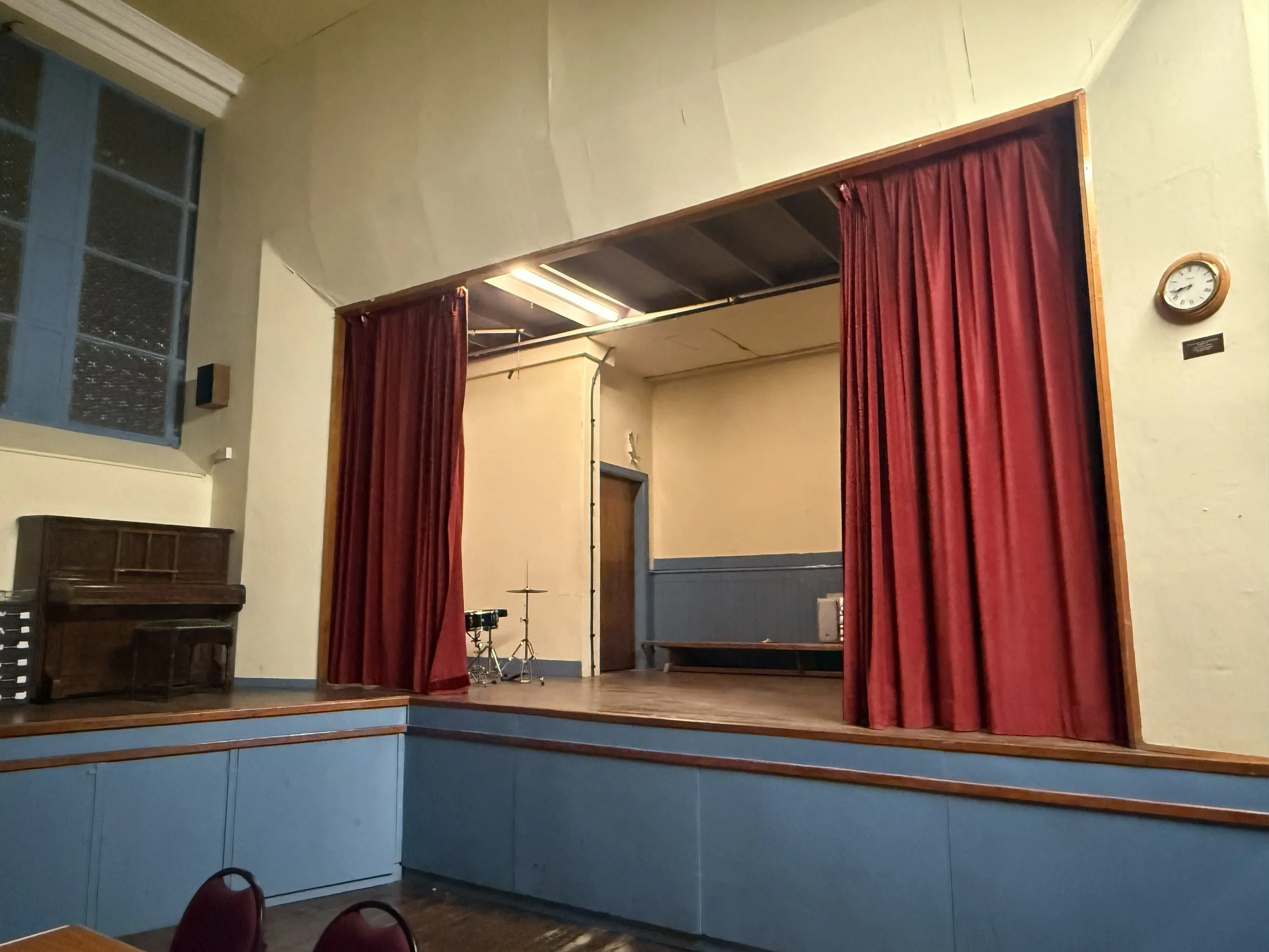Our lower hall is a flexible space that works well as both a meeting room and a small theatre. Equipped with a stage, curtains, and lighting, it’s ideal for rehearsals and smaller productions, while also serving as a comfortable setting for meetings and group gatherings. A well-equipped kitchen is located just next door, making it easy to provide refreshments or catering for your event.